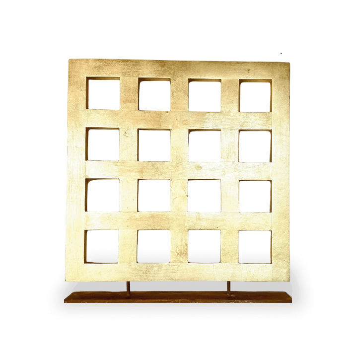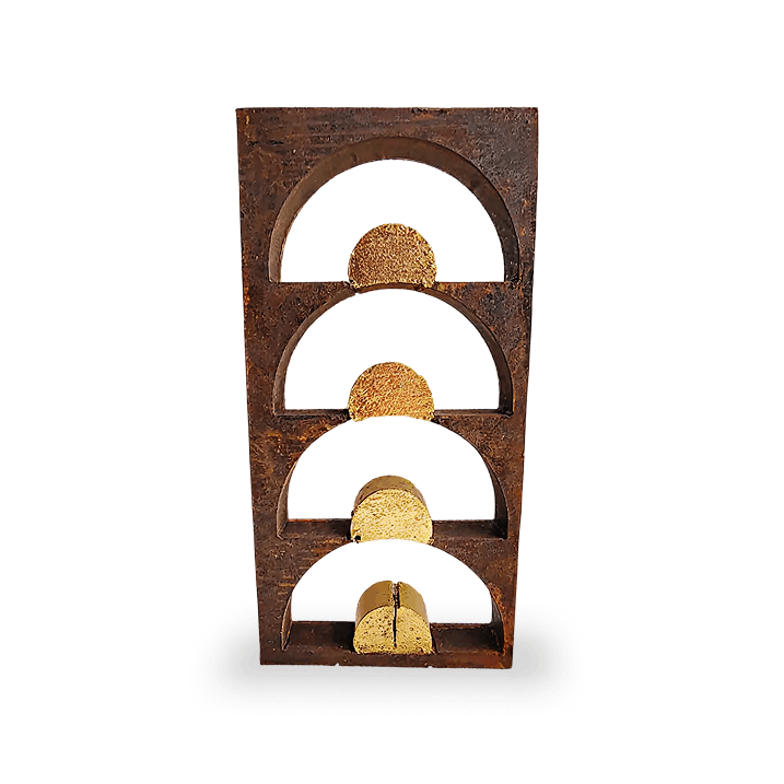 Placas de 2" con hoja de oro sobre madera de encino, intemperizado / cera de carnauba.